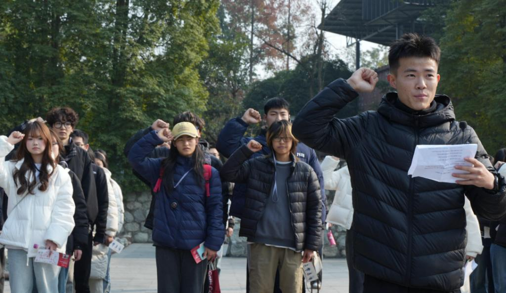师生们依次参观了中国壮士群雕广场、川军抗战馆、正面战场馆、中流砥柱馆四大核心展区。在庄严肃穆的中国壮士群雕广场,全体同学高举右拳庄严宣誓。铿锵有力的誓言中,凝聚着青年学子对革命先烈的深切追思,更饱含着赓续红色血脉、勇担时代使命的坚定决心。