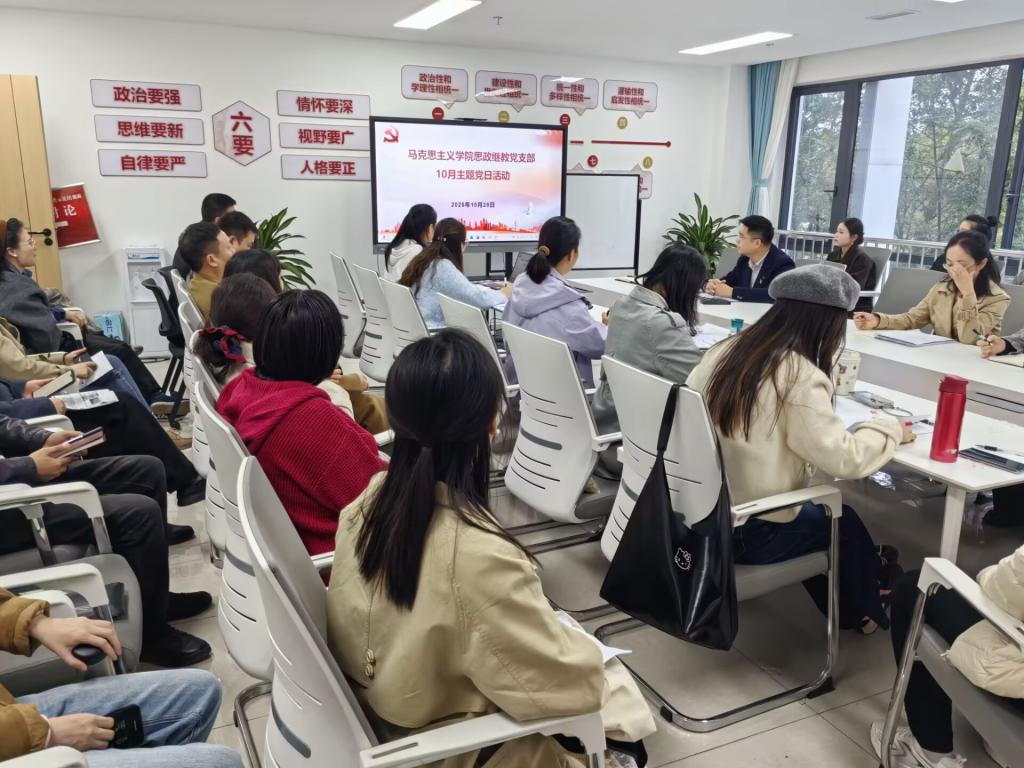 2025年10月28日下午,马院思政继教党支部召开10月主题党日活动,活动为学校宣讲团成员杨涛老师进行省委十二届七次全会精神的宣讲。马院党总支副书记李丹丹主持会议,全体党员参加此次学习活动。
