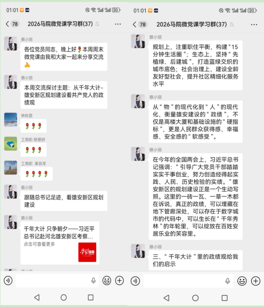 为深入学习贯彻习近平新时代中国特色社会主义思想,树立和践行正确政绩观。2026年3月27日,思政继教党支部书记蔡小丽在“2026马院微党课在线学习群”主持召开微党课专题学习,思政继教党支部全体教师参会,此次微党课围绕“从千年大计雄安新区规划建设看共产党人的政绩观”展开深入交流与研讨。